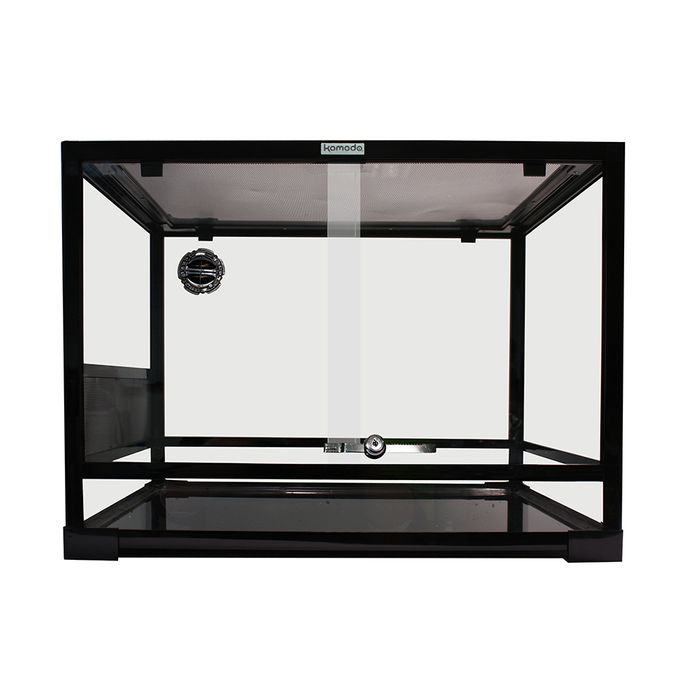This Komodo Glass Terrarium is an easy to assemble black glass terrarium which has a classic look. The combination of functional design with a visually attractive gloss finish makes them a stylish choice and is ideal for keeping a variety of reptiles. The water tight base and superior ventilation also makes them the perfect choice for keeping humid habitats and semi-aquatic species. There are prevention clips on the terrarium which help to prevent the escape of even a small insect, and all of the front opening habitats include a sliding glass lock. The terrarium also has a removable mesh top and side vent, which helps with reducing the build up of CO2.