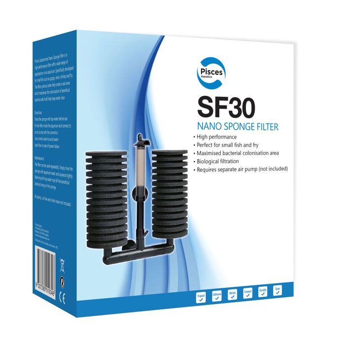 Pisces Nano-Sponge Filter is a high performance filter with a wide range of applications in an aquarium. Specifically developed for small fish such as guppy, neon, shrimp and fry. The filters porous sponges help create a vast area which maximises the colonization of beneficial bacteria which will help keep water clear.
